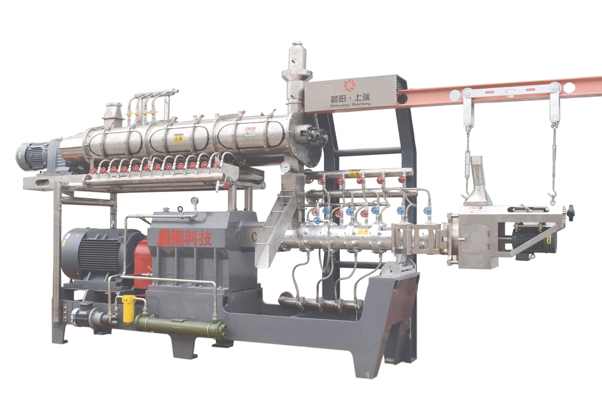 6.加 水進(jìn) 入擠 壓 機 是 為 了 更 好 的 調 和, 如 果 加 水 過(guò) 度 就 會(huì ) 使 產(chǎn) 品 有 小 尾 巴, 結 塊 和 產(chǎn) 品 的 相 互 粘 結。 達到12%的 水 可 以 加 入 擠 壓 機( 正 常8% 多 一些), 達 到1% 的蒸 汽 可 加 入 擠 壓 機。