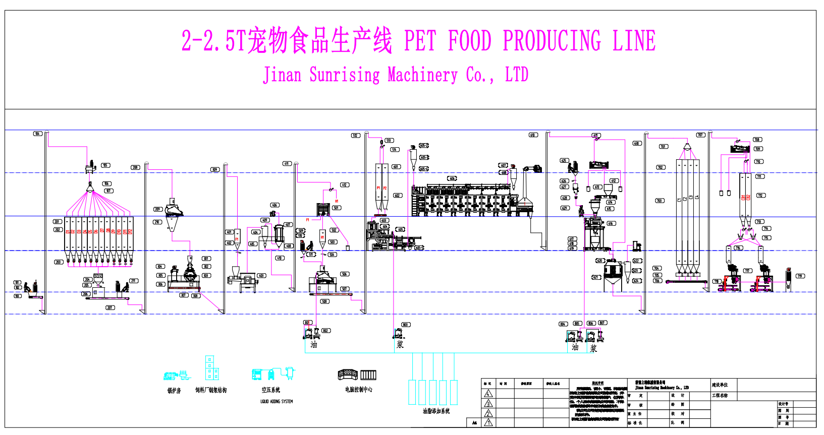本套2-2.5T/h寵物食品生產(chǎn)線(xiàn)工藝特點(diǎn),因客戶(hù)是空地建設,我司設計首先考慮工藝流程的順暢,在設計上人性化布局,采用4層鋼結構設計,車(chē)間建設高度19米(因客戶(hù)政府高度限制),工藝方面使用國內主流二次混合,二次粉碎、雙螺桿膨化機、真空噴涂、逆流冷卻,產(chǎn)品混色,包裝碼垛等全部自動(dòng)流水線(xiàn)。配料倉采用12倉,滿(mǎn)足多種配方配料要求,配料軟件采用布勒系統。配料穩定,可儲存多種配方,配料記錄可留檔查詢(xún),原料混合使用雙軸漿葉混合機,混合均勻度≥98%,雙軸混合機排料殘留低,可保證每批原料的混合均勻度一致,粉碎機工藝采用粗粉加細粉,批次粉碎。避免不同原料進(jìn)粉碎機因過(guò)篩問(wèn)題產(chǎn)生沉降層。粗粉碎使用臥室錘片粉碎機,粉碎細度20目,產(chǎn)量高。細粉使用超威粉碎機,刀頭使用鎢合碳化鋼,硬度高。粉碎細度80目過(guò)篩率95%。保證產(chǎn)品成型表面光滑,無(wú)凹凸顆粒狀。在二次混合添加微量元素和一定比例油脂,提高產(chǎn)品油脂含量。膨化機使用雙螺桿膨化機,產(chǎn)品穩定,烘干使用帶式低溫干燥,微量元素熱損低,噴涂使用真空噴涂,油脂添加30%。使用翻板逆流冷卻器,冷卻效果好,配置4倉暫存倉,可以存儲4種不同顏色的產(chǎn)品,每個(gè)倉存儲可以到6個(gè)小時(shí)膨化產(chǎn)能的產(chǎn)品??梢酝瑫r(shí)四個(gè)顏色進(jìn)行混合,包裝方面配置自動(dòng)打包稱(chēng),自動(dòng)碼垛機,給帶式包裝機,包裝規格500g-25kg全部實(shí)現。