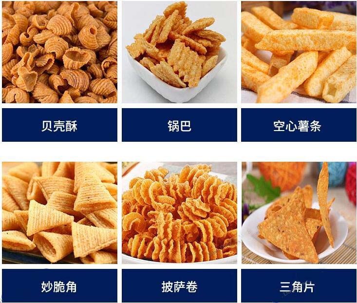 成型和切斷:通過(guò)成型機和切斷機將膨化后的物料成型并切斷成所需的形狀,如三角、小葫蘆、小魚(yú)、牛角等