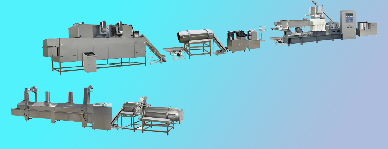 拌粉機→真空上料機→雙螺桿膨化機→展平冷卻機→整形切斷機→提升機-篩選機-提升機-八米五層干燥機-油炸機-震動(dòng)脫油機-單滾筒調味機