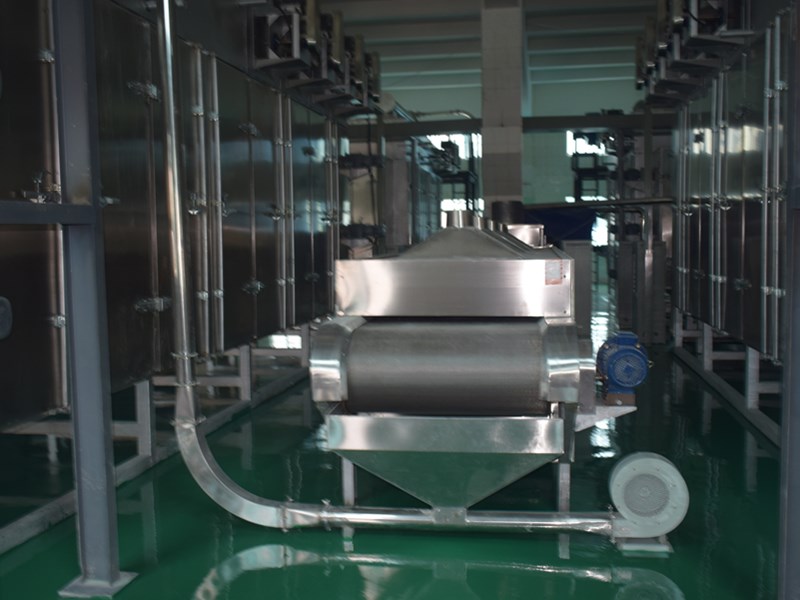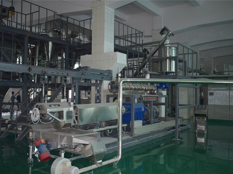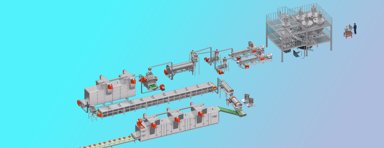 拌粉機→螺旋提料機→膨化主機→振動(dòng)篩→風(fēng)送機→壓片機→風(fēng)送機→冷卻攤料機→五層烘箱→提升機→震動(dòng)攤料機→高溫烘干機→提升機→單滾筒噴涂線(xiàn)→烘箱→冷卻輸送機