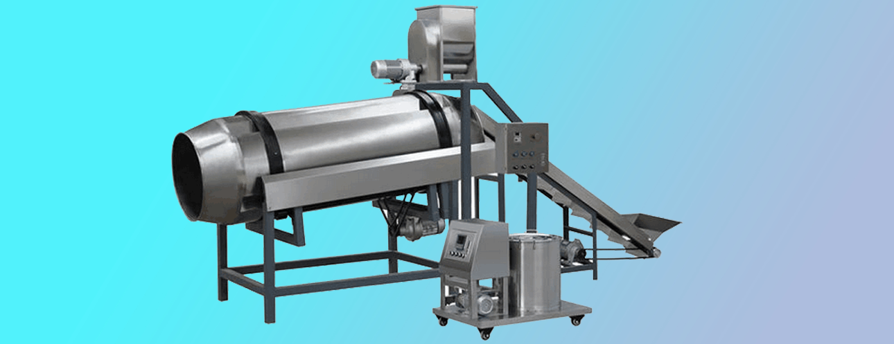 單滾筒調味設備主要用于休閑膨化食品、寵物食品的表面噴油與調味,具有產(chǎn)量高,可連續作業(yè)等特點(diǎn)。滾筒前端先噴油,物料表面有粘性后 在滾筒中端再撒入調味粉,調味粉可以更好的黏附在產(chǎn)品表面。