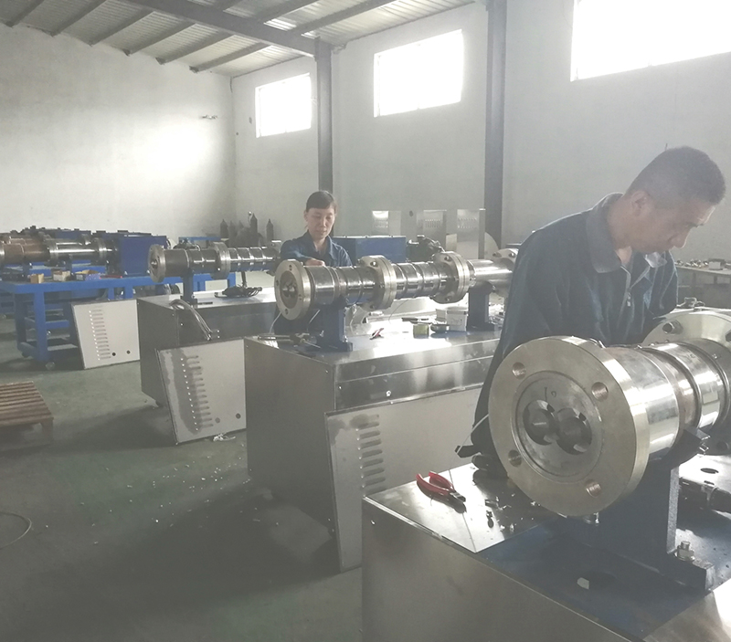 (2)擠出系統: 由螺桿,機筒,連接段組成; 螺桿為38crmoal材料,滲氮深度5mm,耐磨耐用,機筒為國標45號鋼,與螺桿配合間隙控制在0.5mm以?xún)?br /> (3)加熱系統:由環(huán)繞在機筒上的加熱圈組成;根據不同型號膨化由多個(gè)獨立控制加熱區域組成,控溫