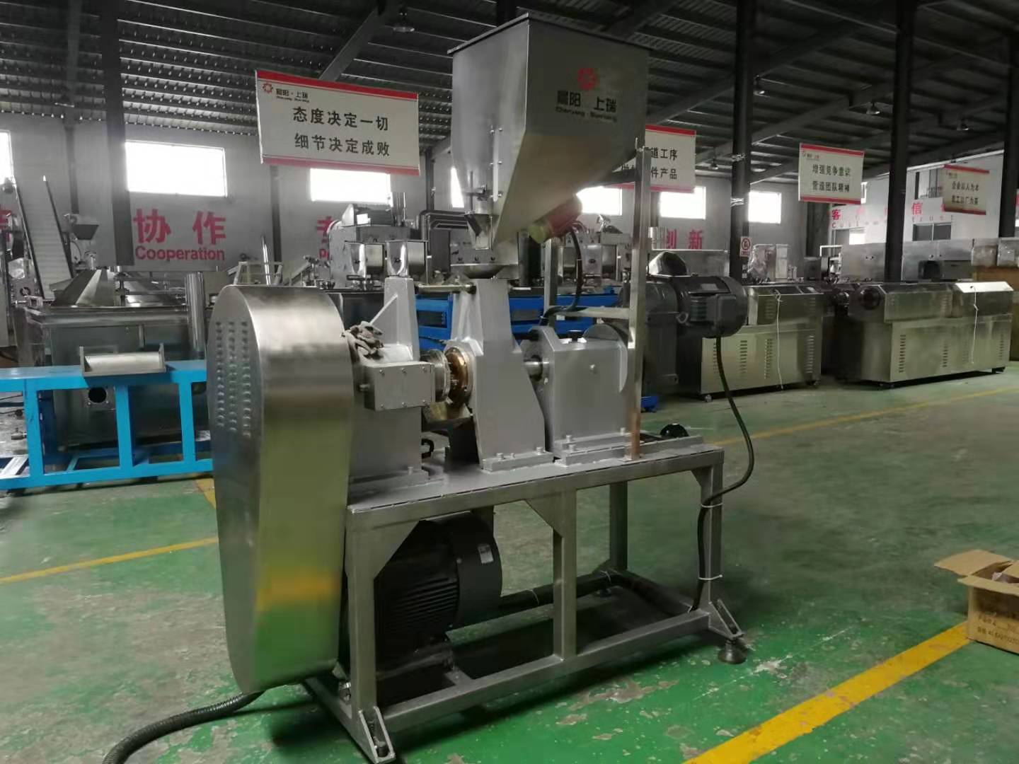 (2)擠出系統: 由螺桿,機筒,連接段組成; 螺桿為38crmoal材料,滲氮深度5mm,耐磨耐用,機筒為國標45號鋼,與螺桿配合間隙控制在0.5mm以?xún)?br /> (3)加熱系統:由環(huán)繞在機筒上的加熱圈組成;根據不同型號膨化由多個(gè)獨立控制加熱區域組成,控溫