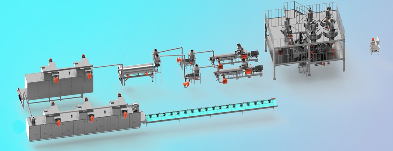 大型生產(chǎn)線(xiàn):自動(dòng)配料站→粉碎機→混合機→膨化主機→振動(dòng)篩-風(fēng)送機→均質(zhì)滾筒-風(fēng)送機-多層振動(dòng)烘干機→風(fēng)送機-微波干燥-風(fēng)送機-二次烘干機-風(fēng)送機-多層振動(dòng)冷卻機-Z型提升機-包裝機