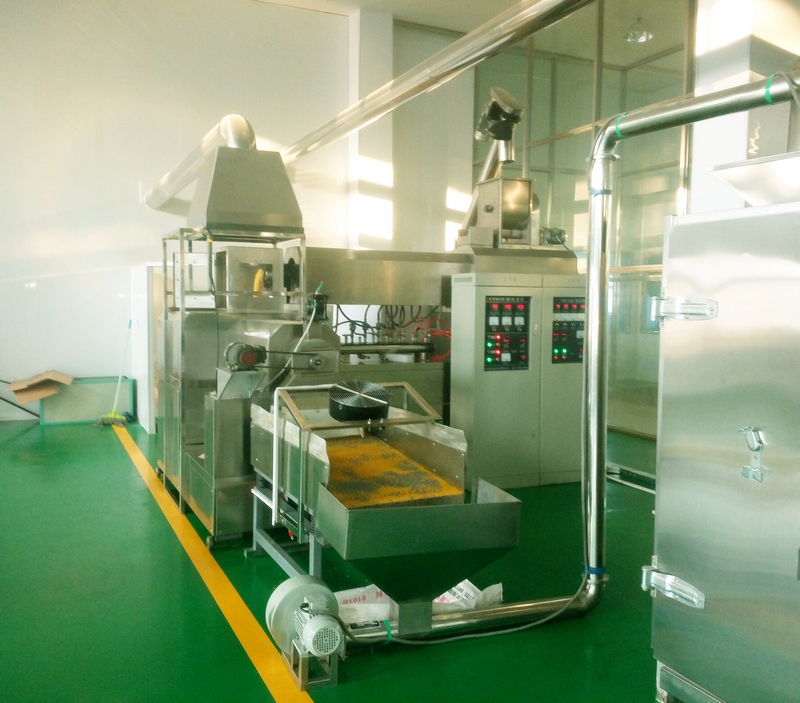 自動(dòng)配料預處理-粉碎-混合-擠壓熟化-均質(zhì)-震動(dòng)烘干-二次烘干-冷卻