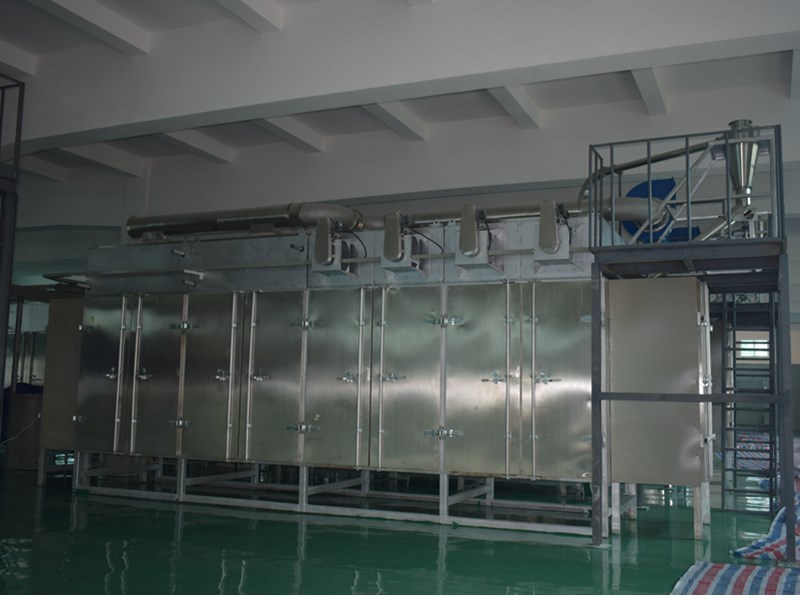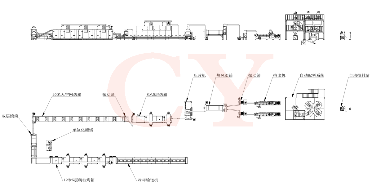拌粉機→螺旋提料機→膨化主機→振動(dòng)篩→風(fēng)送機→壓片機→風(fēng)送機→冷卻攤料機→五層烘箱→提升機→震動(dòng)攤料機→高溫烘干機→提升機→單滾筒噴涂線(xiàn)→烘箱→冷卻輸送機